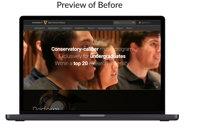 Blair School of Music needed a digital encore. Their site was stuck in the past, missing the mark with today’s tech-savvy students. My mission? A total redesign that hit all the right notes—user-friendly, visually striking, and perfectly in tune with Vanderbilt’s brand.